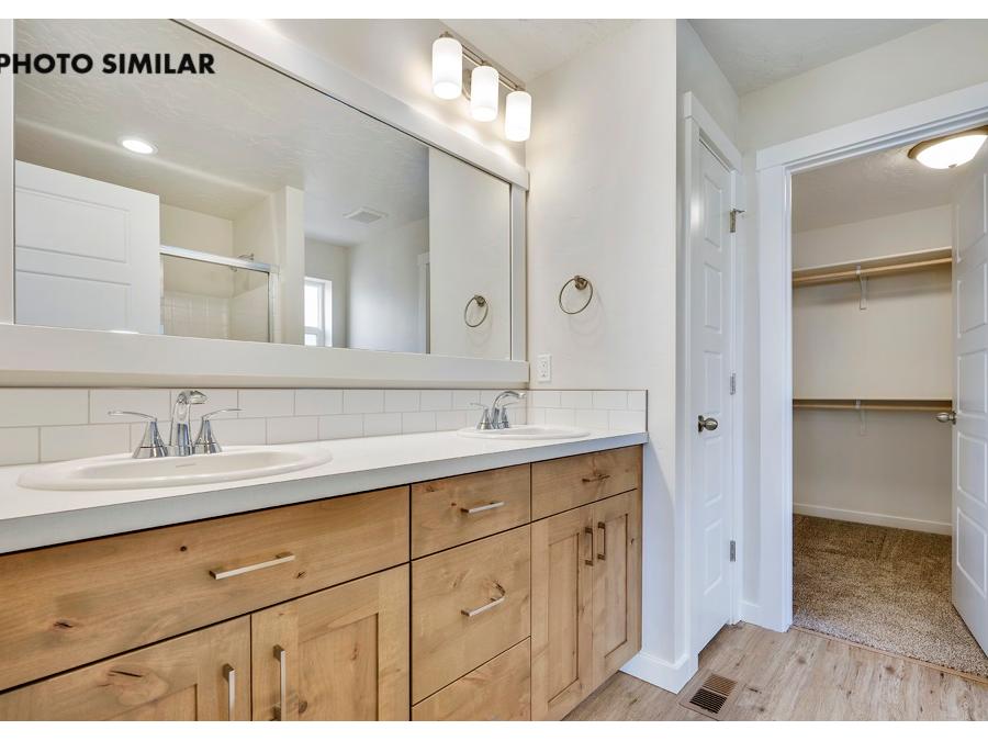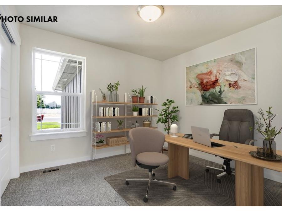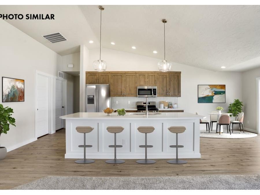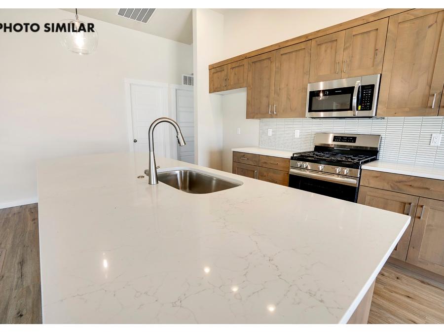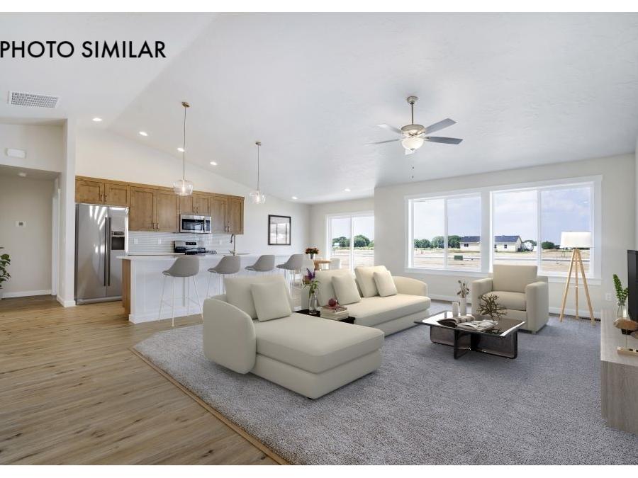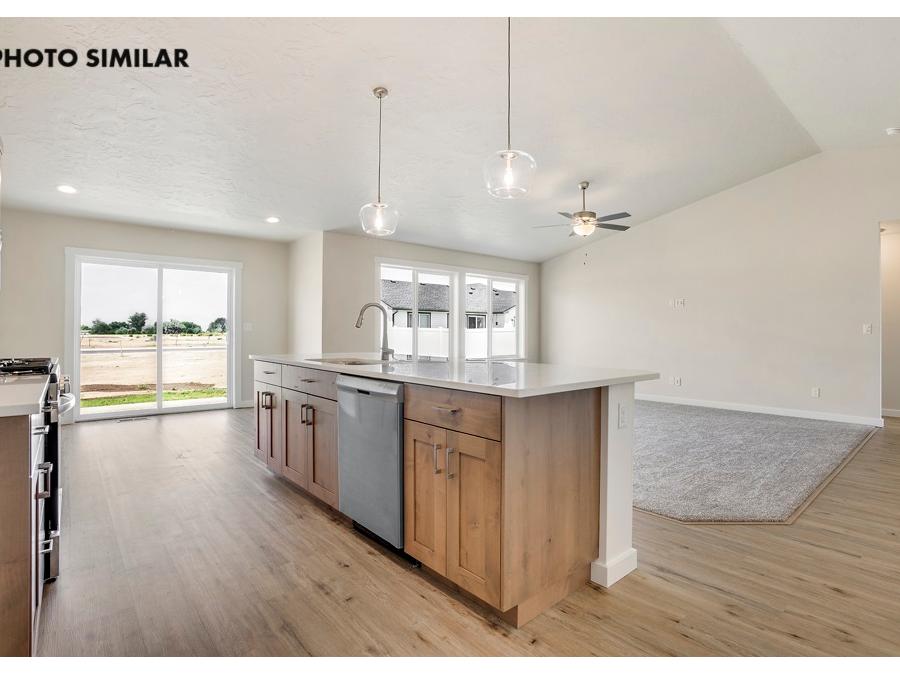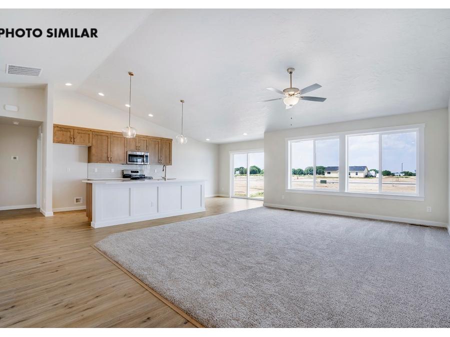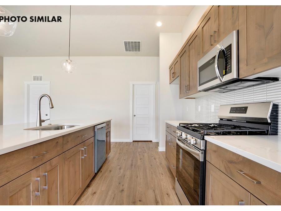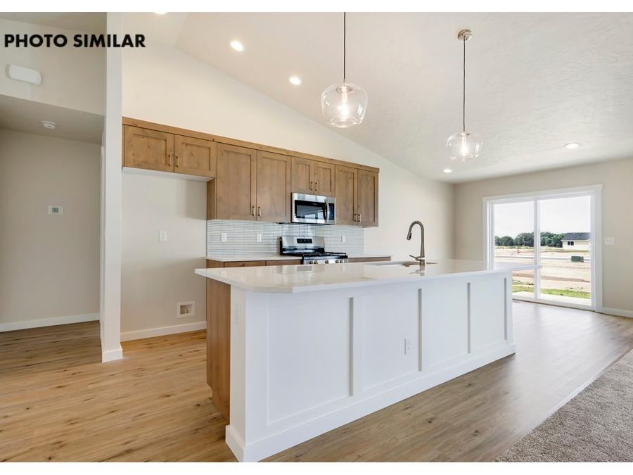 Fantastic farmhouse-style home with a comfortable, open floor plan and desirable split bedroom design. The spacious great room flows into a beautifully appointed kitchen featuring quartz countertops, full tile backsplash, knotty alder cabinets, and a large walk-in pantry. Enjoy natural gas service and thoughtful finishes throughout. The north-facing backyard offers a great space to relax with full front and rear sod, automatic sprinklers, and pressurized irrigation. Complete with a 3-car garage and conveniently located close to schools, this home combines style, function, and everyday comfort. The sales price does not include the buyer's agent compensation. We are happy to add buyer's agent compensation to the sales price.